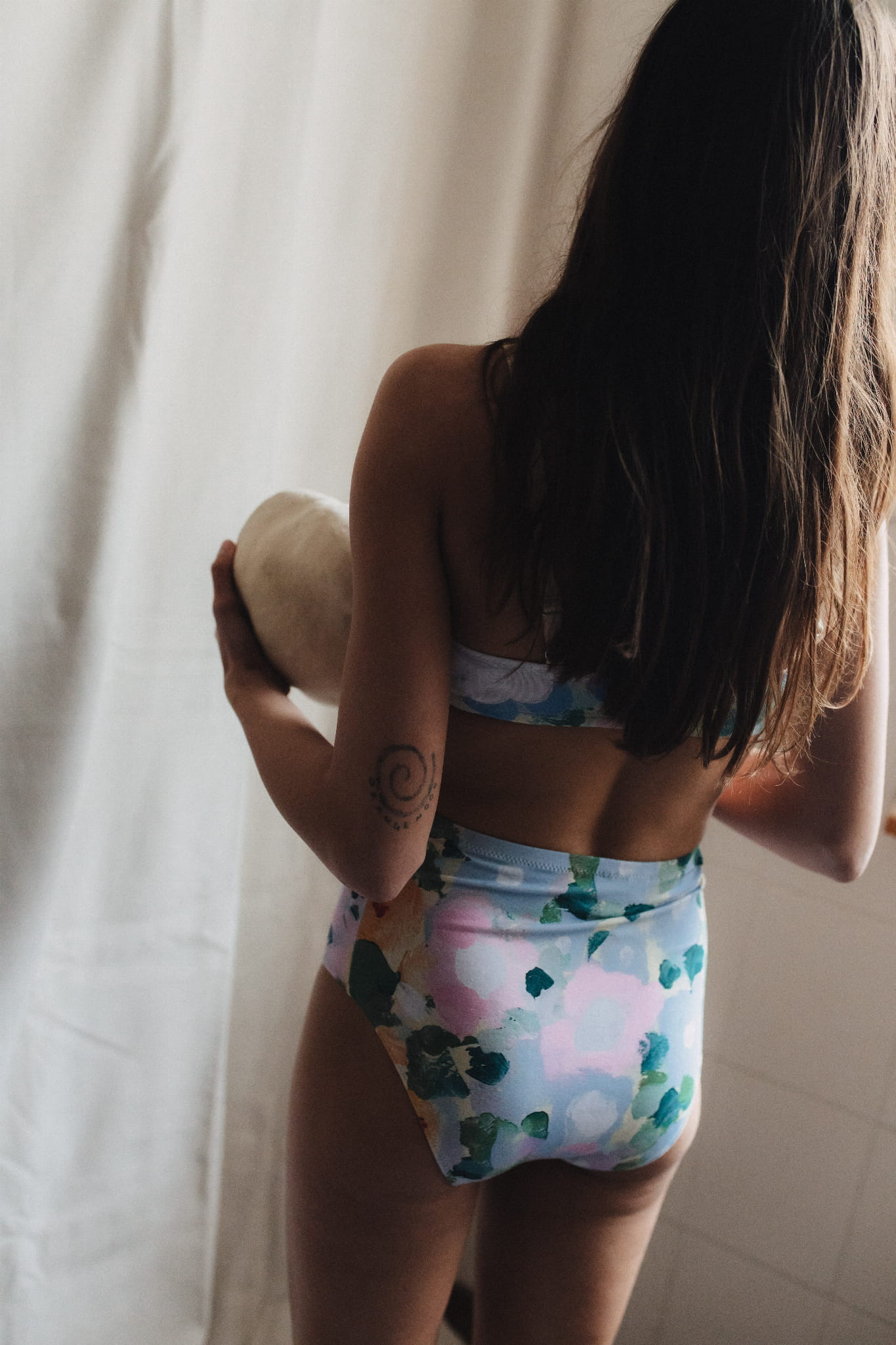 Efekt współpracy FIG the BRA z Łąka Studio — autorskiej marki Beaty Plutowskiej, artystki tworzącej malarstwo i ceramikę.